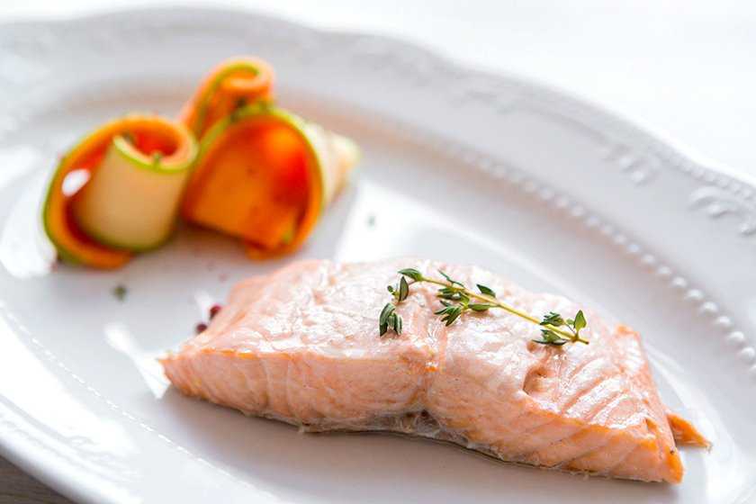 - Ужин — рыба, приготовленная на пару, и салат из морской капусты.