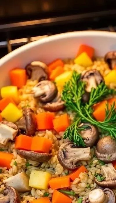 Ингредиенты: 1 стакан гречки, 300 г грибов (шампиньоны, вешенки, лисички), 1 луковица, 1 морковь, 1 болгарский перец, 2 зубчика чеснока, 2 ст. л. растительного масла, 1 стакан овощного бульона, соль, перец, тимьян, розмарин по вкусу, 50 г тертого сыра (по желанию). Время приготовления: около 60 минут. Калорийность: примерно 280-350 ккал на порцию.