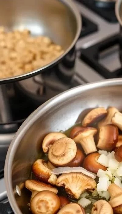 Шаг 2: Обжарка овощей и грибов. В глубокой сковороде разогрейте растительное масло. Обжарьте лук до золотистого цвета. Добавьте морковь и обжаривайте еще 5-7 минут, помешивая. Затем добавьте грибы и обжаривайте до тех пор, пока они не станут мягкими и не испарится лишняя жидкость (около 10-15 минут). Добавьте чеснок и обжаривайте еще 1 минуту.