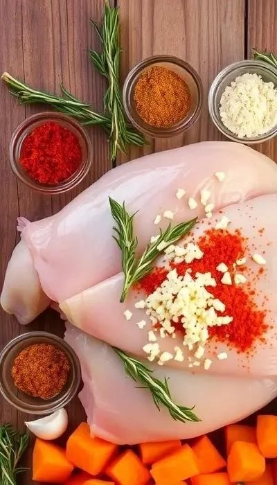 Также нам потребуются: лук (1 шт.), чеснок (2-3 зубчика), специи (паприка, черный перец, сушеный чеснок, итальянские травы), соль по вкусу и немного оливкового масла (1-2 ст.л.) для маринования курицы.