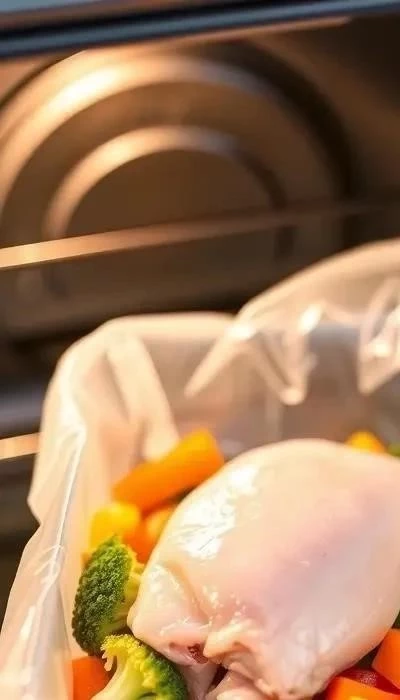Шаг 4: Разогрейте духовку до 180°C. Поместите рукав с курицей и овощами на противень и отправьте в разогретую духовку на 40-50 минут. Время приготовления может варьироваться в зависимости от вашей духовки.