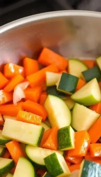 Затем добавьте морковь и перец, обжаривайте еще 5-7 минут, периодически помешивая. Добавьте измельченный чеснок и обжаривайте еще 1 минуту, пока не появится аромат. Добавьте цукини и готовьте еще 3-5 минут, пока овощи не станут мягкими, но сохранят хрустящую текстуру.