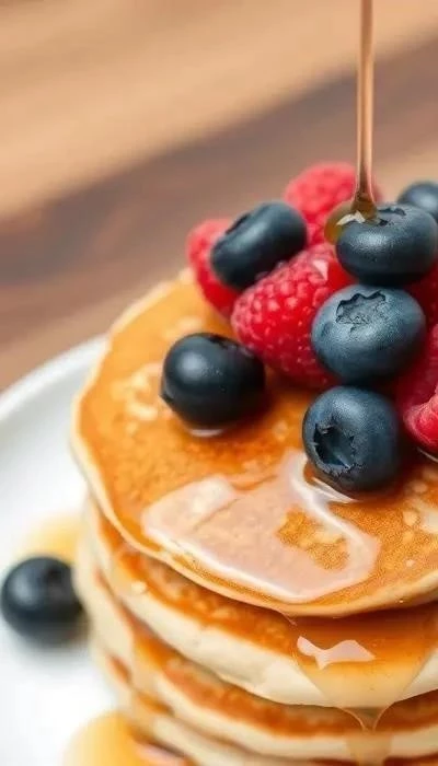 Пищевая ценность (примерно на 1 порцию из 3-4 панкейков): Калорийность: около 250-300 ккал, Белки: 8-10 г, Жиры: 5-7 г, Углеводы: 40-45 г.