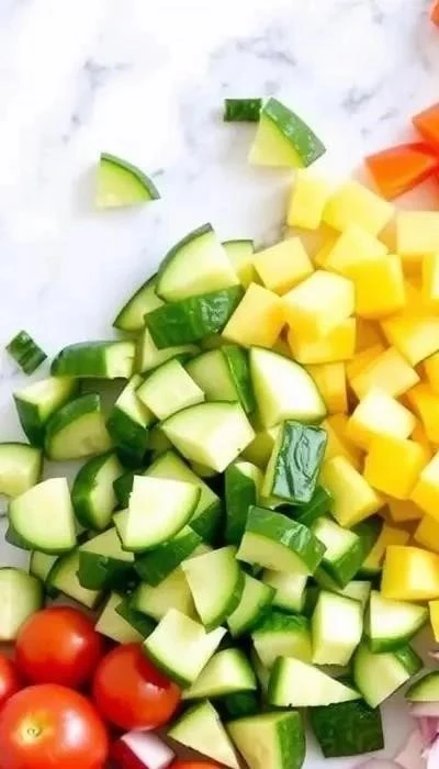 Подготовка овощей: Огурец и болгарский перец вымойте и нарежьте кубиками. Красную луковицу очистите и мелко нарежьте. Зелень промойте, обсушите и мелко порубите.