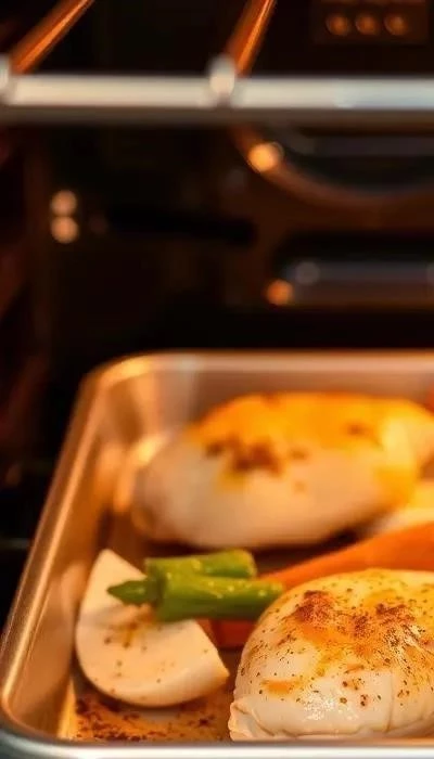 Шаг 3: Запекаем в духовке. Разогреваем духовку до 180°C. Накрываем форму фольгой и запекаем в течение 20 минут. Затем снимаем фольгу и запекаем еще 10-15 минут, или до тех пор, пока курица не станет полностью готовой и не приобретет золотистый цвет. Время запекания может варьироваться в зависимости от толщины куриной грудки и мощности духовки. Шаг 4: Проверяем готовность. Проткните куриную грудку ножом или вилкой. Если сок, вытекающий из мяса, прозрачный, значит, курица готова. Если сок розовый, продолжайте запекать еще несколько минут.