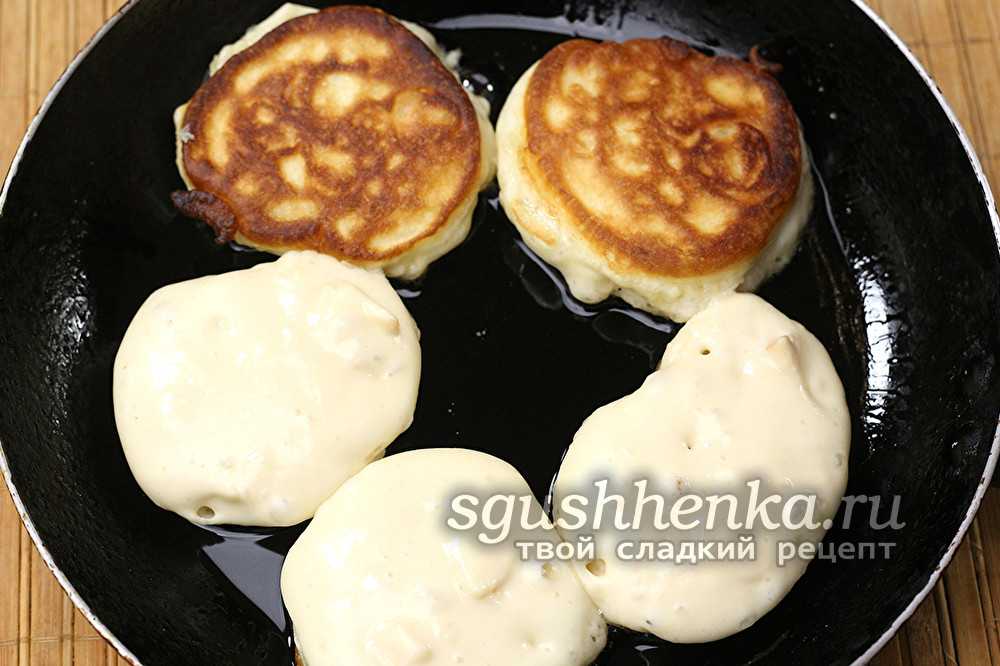Но важно не перестараться. Большое количество фруктов сделает тесто жидким, сок будет стрелять на сковороде и может ничего не получиться