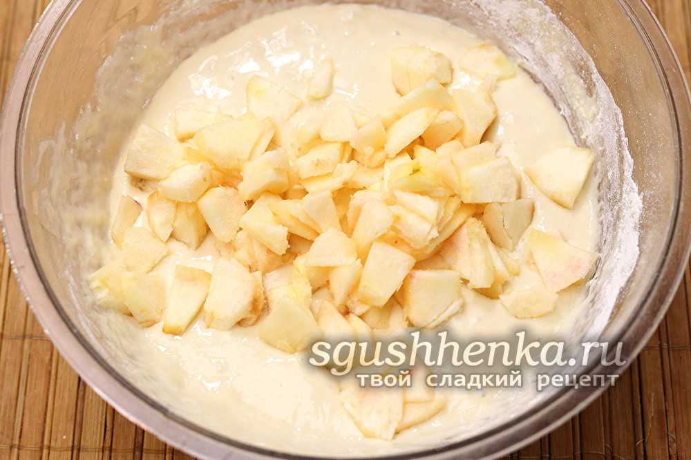 Вводим яблоки в уже поднявшееся тесто и тщательно перемешиваем.