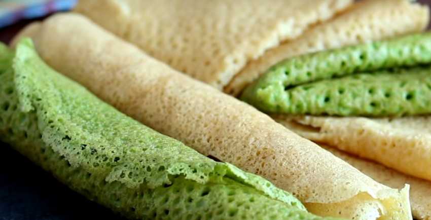 Для получения красивого зеленого цвета, в половину теста добавляем смесь измельченной петрушки и/или шпината, крахмала и воды.