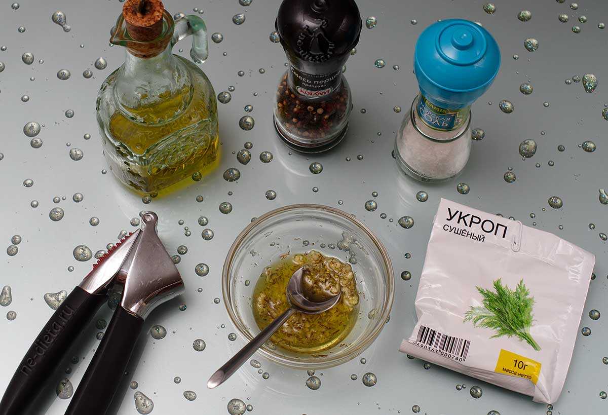 Мелко нарезали свежий ароматный укроп, выдавили чесночок, посолили, поперчили, налили оливкового масла, перемешали.
