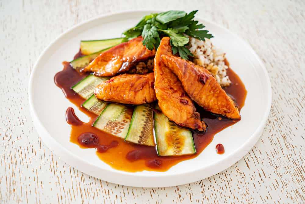 Грудку режем небольшими кусочками и складываем в миску. Добавляем измельченный чеснок, приправу, соль, маринованный имбирь, растительное масло. Все перемешиваем и оставляем на 2 часа, чтобы курица настоялась.