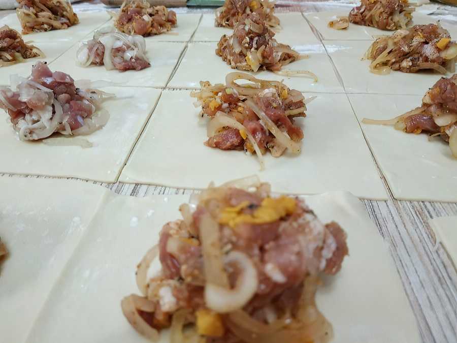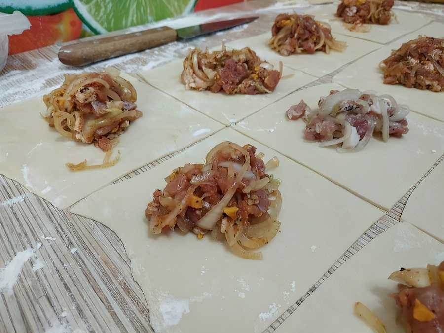 Кусочки тесто раскатываются в длинную полосу, нарезаясь потом на квадраты, либо раскатке подвергаются небольшие порционные кусочки, как в видео чуть ниже. В каждый из них закладывается рубленый фарш с луком, зеленью и специями.