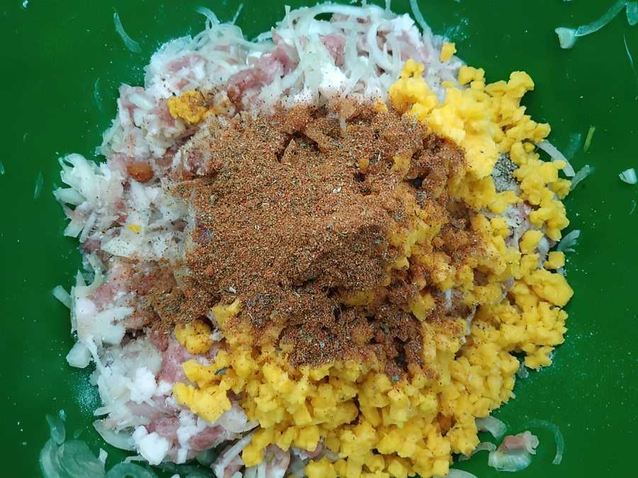 После всё по стандарту — к основному фаршу из рубленного мяса и лука (сочетание один к одному), добавляем тыкву, и приправу. Перемешиваем, и можно приступать к лепке мантов.