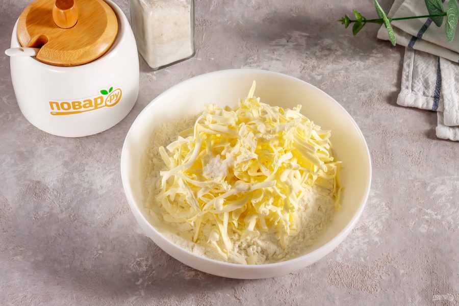 Муку для приготовления теста высыпьте в глубокую емкость. Туда же всыпьте соль и сахар, необходимые для теста. Натрите на терке с крупными ячейками холодное сливочное масло. Тщательно вымешайте всю массу, чтобы у вас получилась песочная крошка. Воду добавлять не нужно, нужна именно крошка из теста.