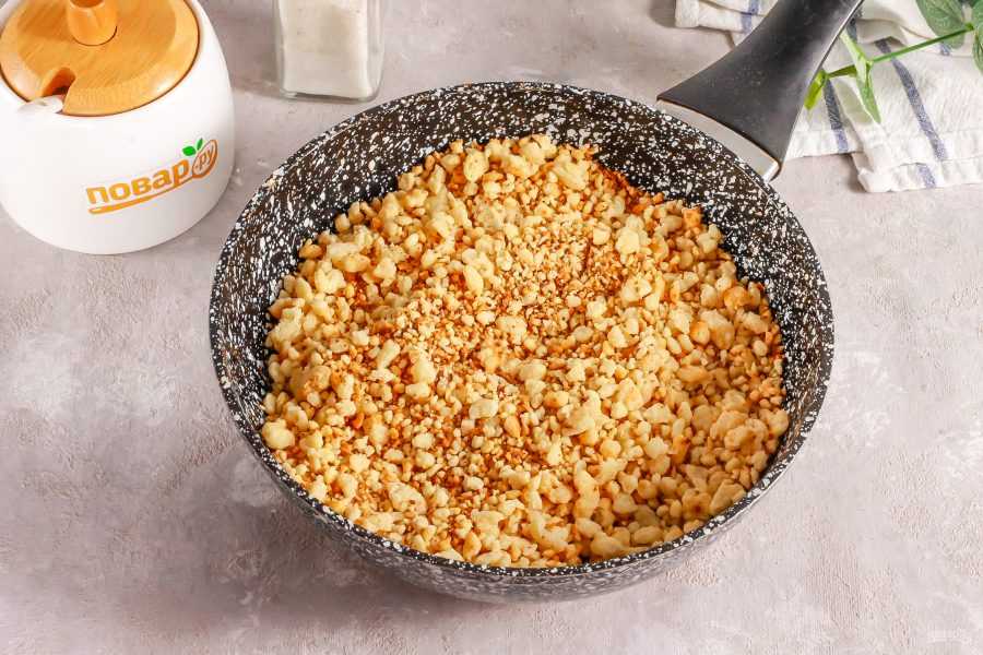Обжарьте песочную крошку до румяности, следя за тем, чтобы она не подгорела. На это уйдет примерно 8-10 минут.
