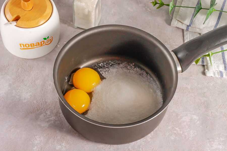 Всыпьте в ковш или кастрюлю с антипригарным дном сахар и выложите желтки куриных яиц. Белки вам не потребуются в рецепте, можете приготовить из них другое блюдо.