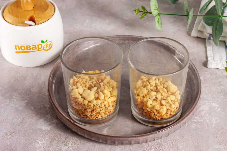 Когда и песочная крошка, и крем остынут, приступите к сборке десертов. Выложите в стаканы или чашки по 2 ст.л. песочной крошки.