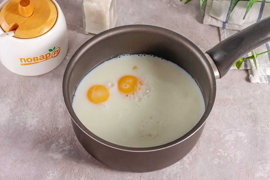 Яйца взбить, влить к ним немного молока (30 мл) и перемешать. Перелить яично-молочную смесь к подготовленному горячему крему и перемешать. Довести массу до кипения, проварить 1 мин и снять с плиты.