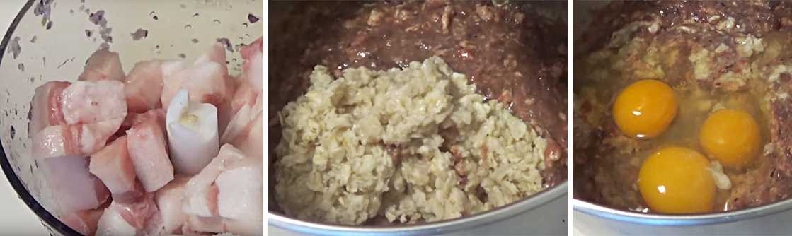 3. Измельчаем отдельно лук и сало, соединяем все ингредиенты. Добавляем запаренную овсянку, яйца, перец, соль. Все хорошо перемешиваем или взбиваем блендером.