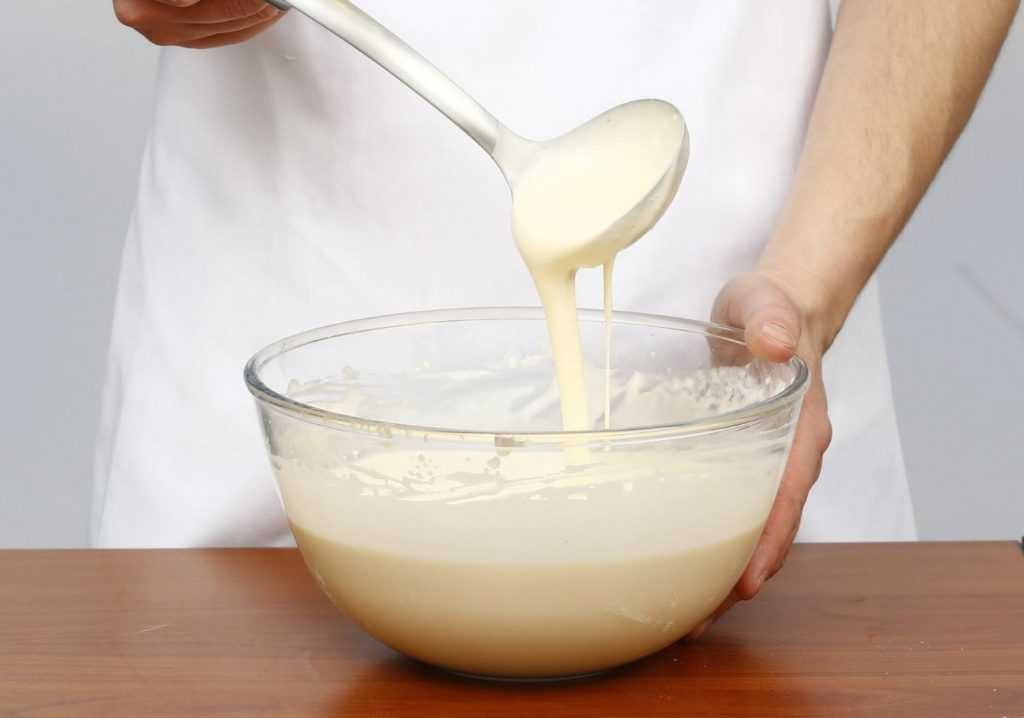 4. Тесто должно получиться довольно жидким. Примерно, как ряженка, или кефир, или как жидкая сметана. Чем оно жиже, тем тоньше получатся румяные «солнышки». Однако, если муки не достаточно, и тесто получится слишком жидким, то готовые блины трудно будет переворачивать. Они попросту будут рваться.