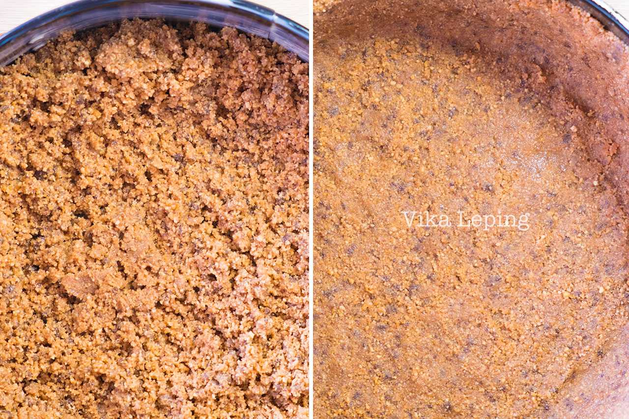 Берем форму для выпекания и аккуратно выкладываем, утрамбовываем тесто из печенья ровным слоем.
