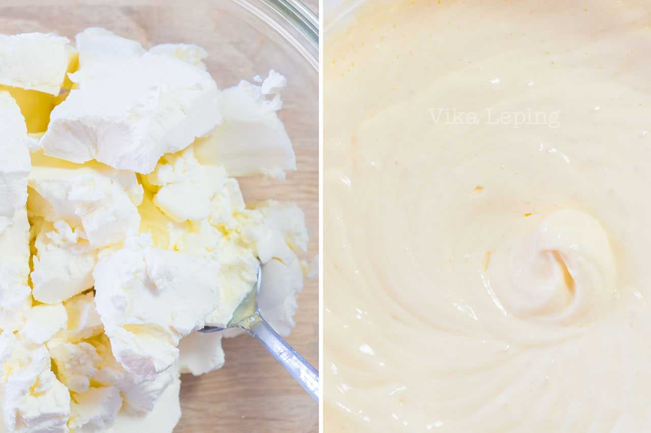 Теперь в глубокую емкость выкладываем сливочный сыр. Взбиваем его венчиком в нежную текстуру. Миксер лучше не использовать, чтобы не наполнить начинку лишним воздухом, иначе она получится похожей на сыр.