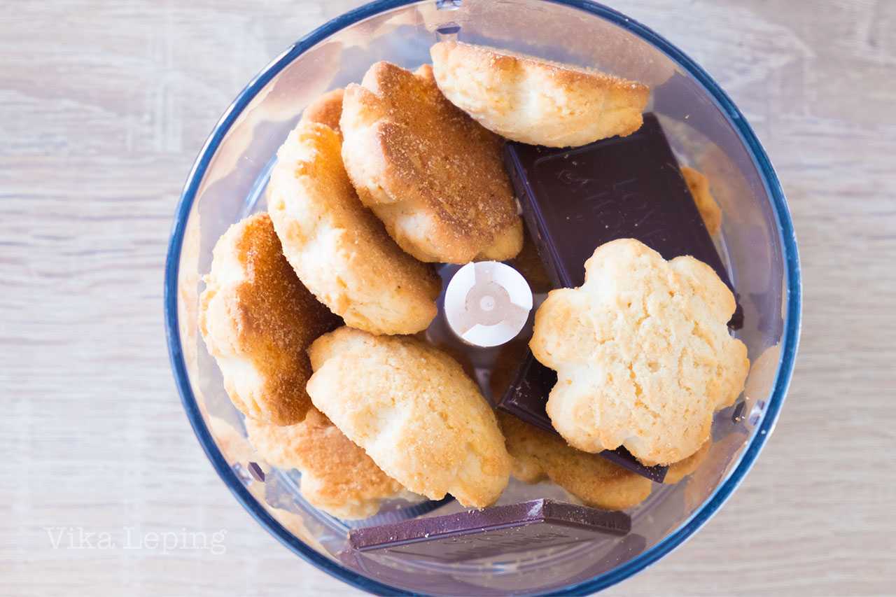 Теперь в комбайн кладем печенье. Можно поломать на кусочки сперва. Нет комбайна? Натрите печенье на терку. Наша цель — измельчить печенье в крошку.