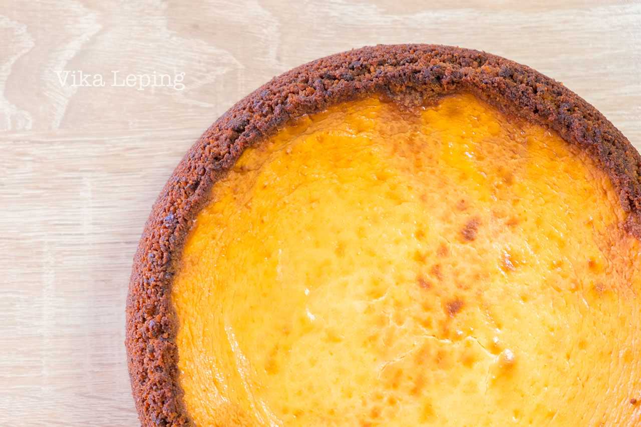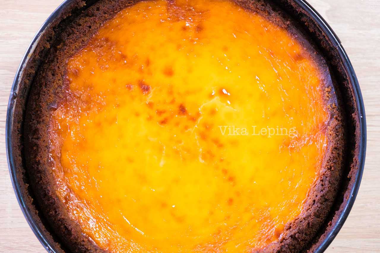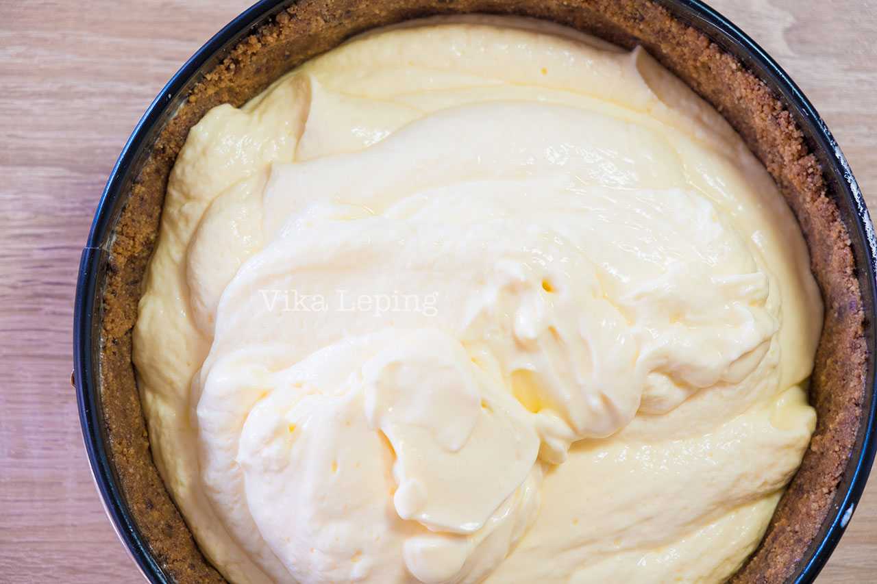 Теперь выкладываем начинку сверху на тесто. Ставим в разогретую духовку и выпекаем при 180 градусах, пока верх не начнет слегка пузыриться. Сразу выключаем духовую печь, открываем ее и даем чизкейку еще постоять до полного остывания.