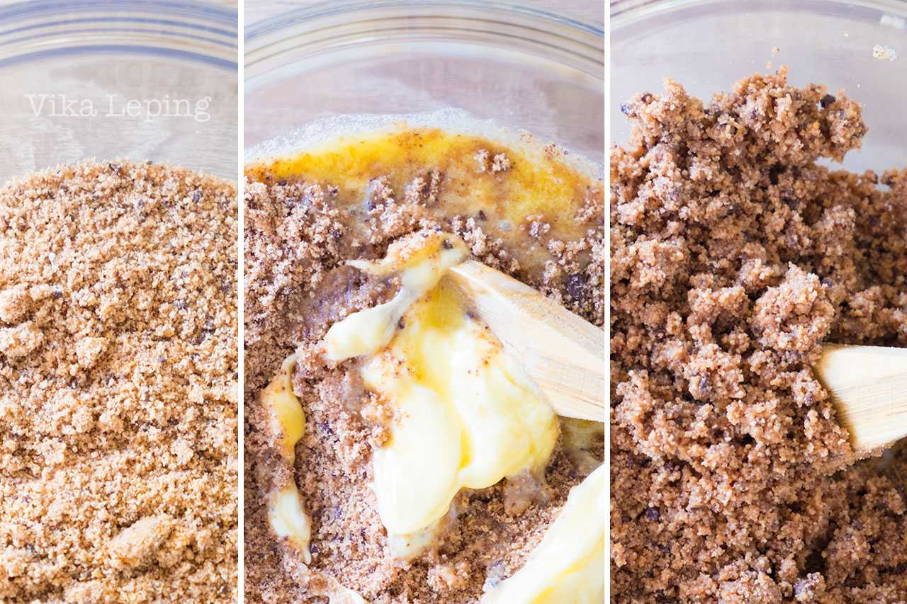 Затем включите программы «Выпечка» на 3 минуты и разогрейте масло. Измельчите печенье и перемешайте его с жидким маслом. Далее добавляйте корицу и мускатный орех. Распределите слой печенья и тщательно прижмите его.