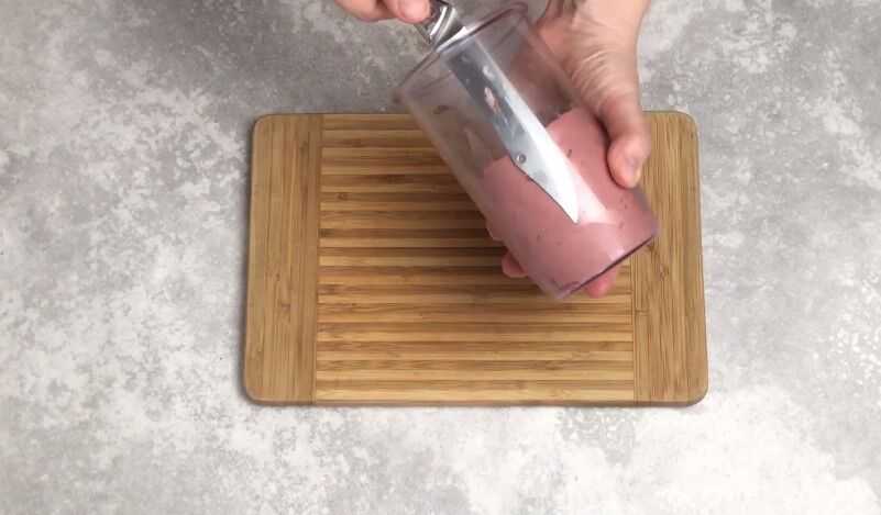 7. С помощью блендера измельчаем куриное мясо. Добавляем в него свекольный сок, мускатный орех, чеснок, желатин и еще раз взбиваем все ингредиенты.