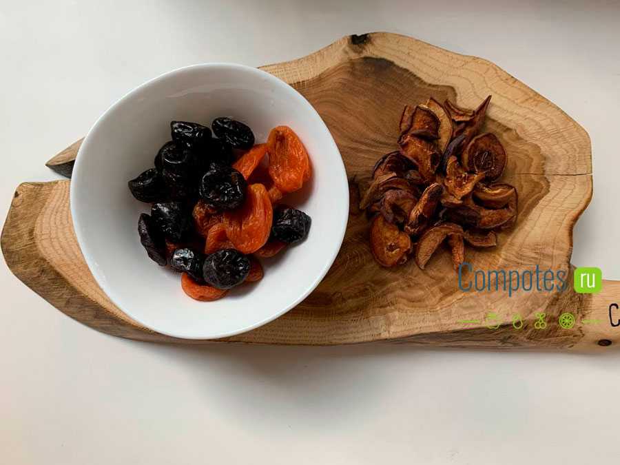 Подготовка – промыть все сухофрукты на дуршлаг и оставить стекать, пока вся жидкость не уйдет. Для домашних яблок и груш такая процедура не понадобится.