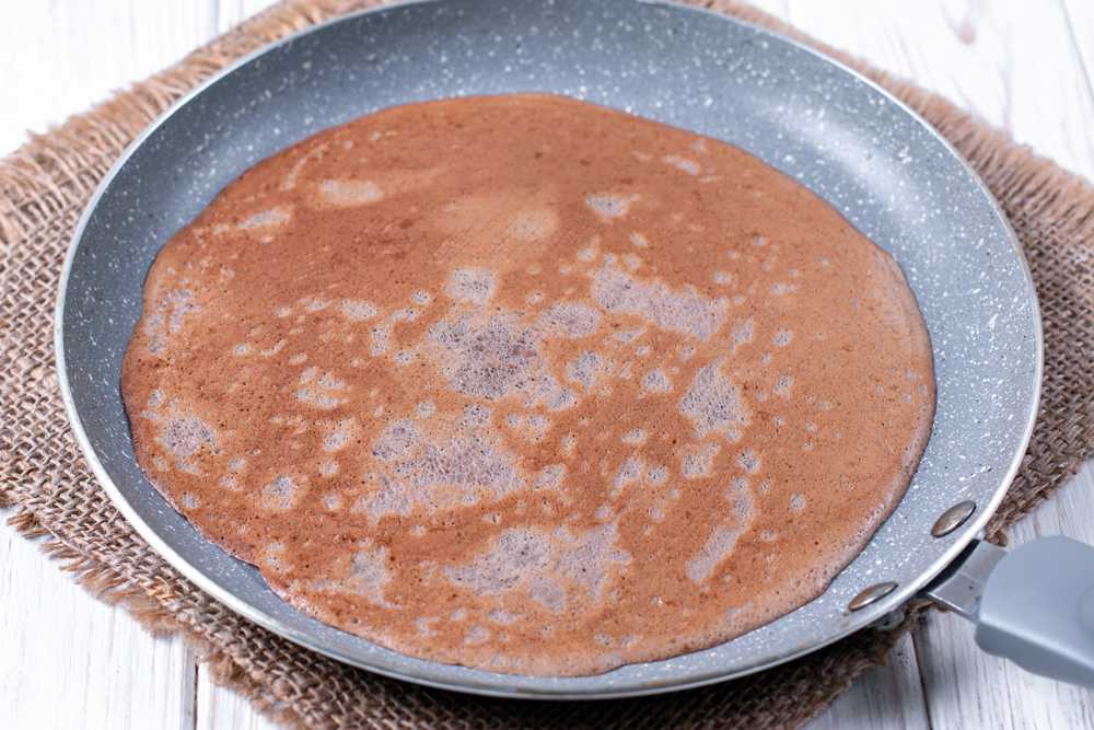 Разболтаю венчиком яйца с щепоткой соли и сахаром. Волью в болтушку молоко, взболтаю еще разок. Понемногу добавлю муку, продолжая взбалтывать смесь. Муки беру сколько получится. Какао разведу в нагретом молочке и вылью в остальной состав. Пару столовых ложек масла волью в жидкое, как редкая сметана, тесто. Размешаю. Сковородку разогрею. Смажу ее небольшим количеством маслица. Жидкое тесто налью половником, сковородку покачаю, дам смеси занять всю поверхность. Когда края блинчика подсохнут, подведу под него лопаточку и переверну. Вторая сторона будет готова быстрее. Все время обжарки занимает минуты 2-3
