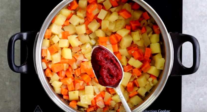 На растительном масле до полуготовности пассеруем морковь и сельдерей, смешиваем с томатной пастой, тушим до тех пор, пока овощи не станут мягкими.