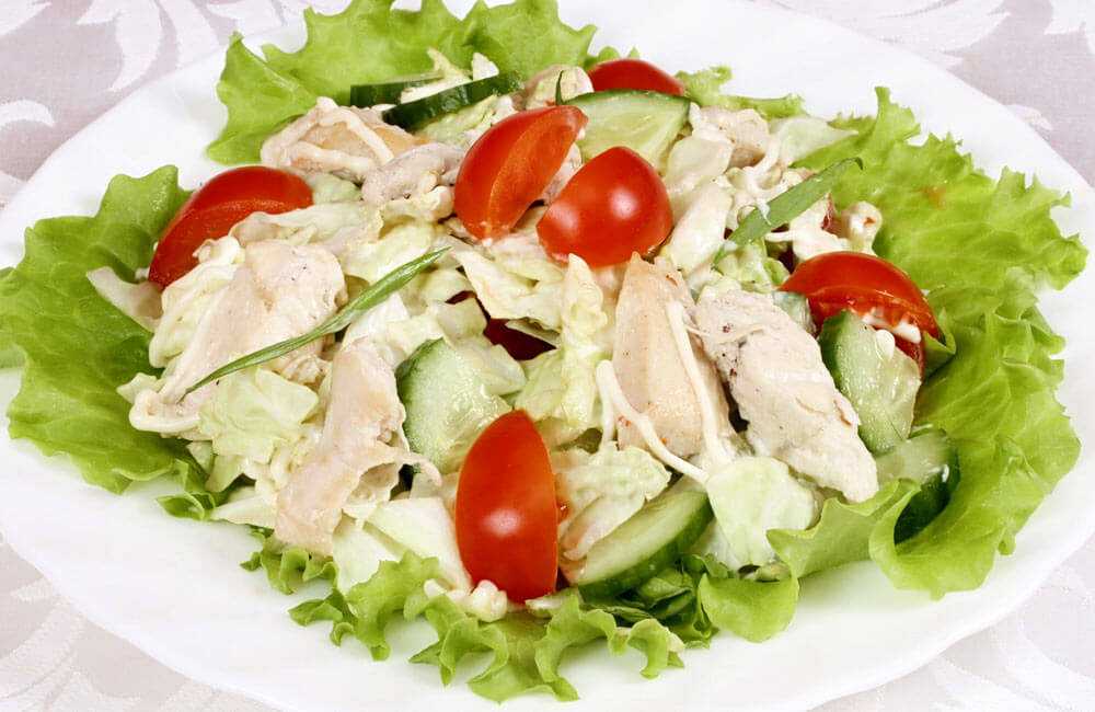 Этот салат отличается от других диетических блюд добавлением куриного мяса.