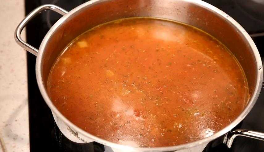 Довести суп до кипения, убавить огонь ниже среднего, накрыть кастрюлю крышкой и оставить вариться на 30 минут.