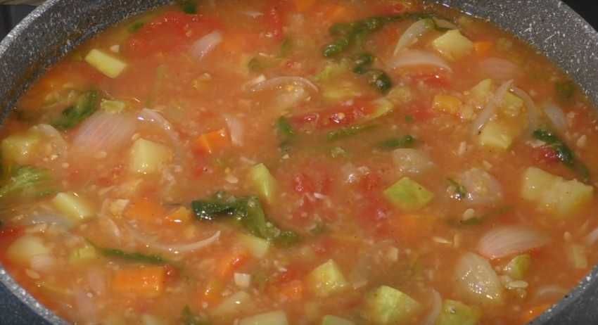 Готовится такой суп просто. Берем кастрюлю с толстым дном, кладем масло и специи. Их нужно прокалить 15 секунд, затем добавить лук, чеснок. Обжариваем и кладем помидоры. Осталось просто залить водой! Время приготовления всего 20 минут!