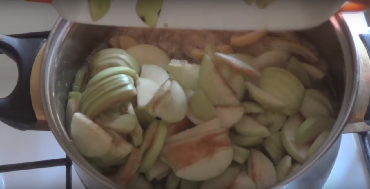 далее осторожно всыпаются яблоки, и все варево помешивается до тех пор, пока дольки плодов не обесцветятся;