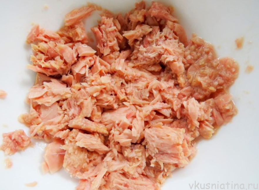 2. Тунец разминаем вилкой, чтобы не было больших кусочков.
