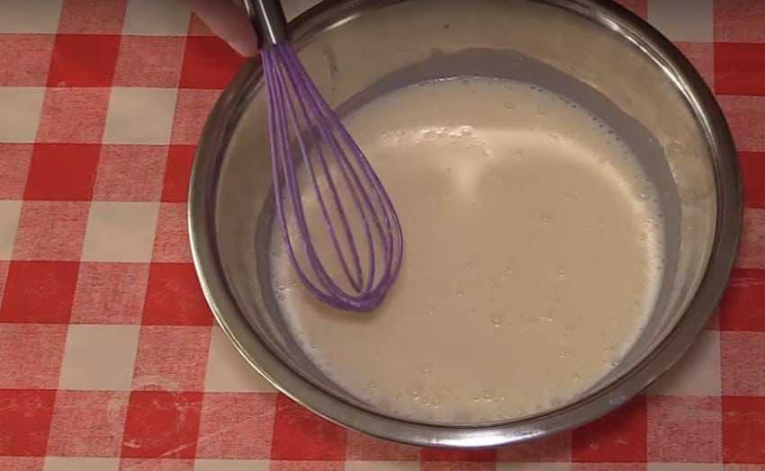 1. Взбейте венчиком яйца, добавьте к ним молоко с кефиром и размешайте. Всыпьте сахар, соль, соду и перемешайте.