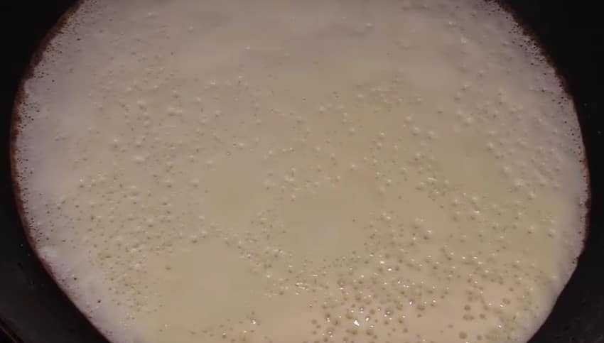 - Когда сковорода достаточно разогреется, вылейте подготовленную смесь в нее и лопаточкой аккуратно распределите по всей поверхности.