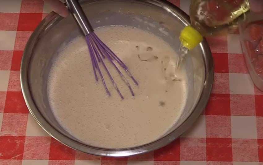 1. Первым делом надо сделать «закваску»: в кефир высыпать соду с сахаром и солью (1 ч. л.), влить подсолнечное масло. Взболтать венчиком, чтобы все ингредиенты растворились друг в друге, и дать минут 10 постоять.