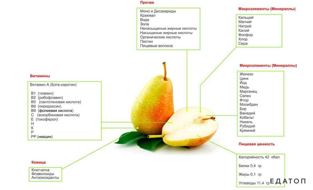 В составе груши содержится в среднем 0,3% протеинов, 0,1% липидов и 14% углеводов. Общая калорийность плодов равна 58,1 ккал на 100 г продукта.