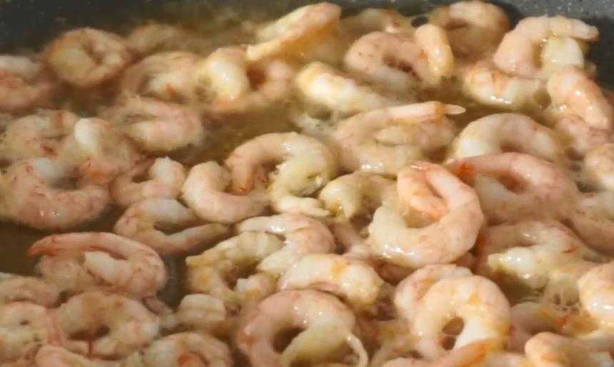 - В ароматное масло выложить креветки, посолить их и сбрызнуть лимонным соком. В течение 2—3 минут обжарить. Готовых рачков переложить на тарелку, дать остыть.