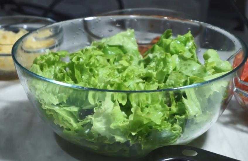 Листы салата порвать руками или же нарубить ножом, отправить в салатник.