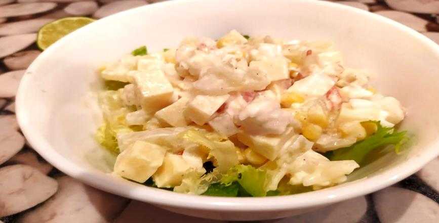 Этот вариант салата тоже готовится без майонеза, но он там и не нужен. В салат добавлен нежный сыр мацарелла, плюс интересная заправка. В результате получается вкусная и очень праздничная закуска. Присмотритесь к этому рецепту.