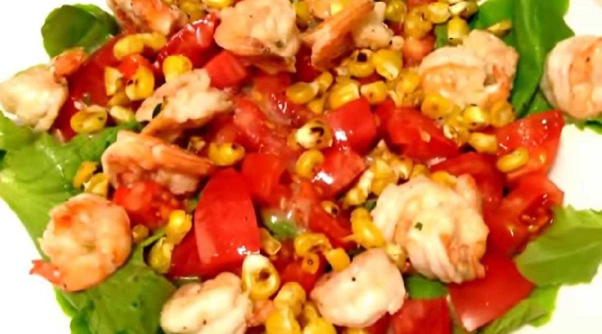 - Срезать зерна с кочана кукурузы, обжарить на сухой сковороде примерно 1 минуту. Выложить обжаренные креветки и кукурузные зерна на салатные листья.