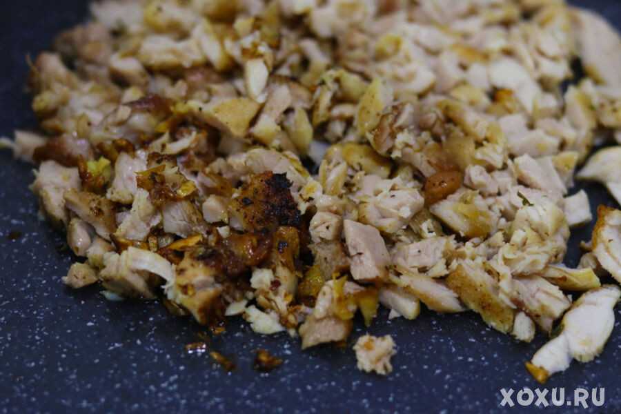 Обжаренное куриное мясо нарежьте средним кубиком.