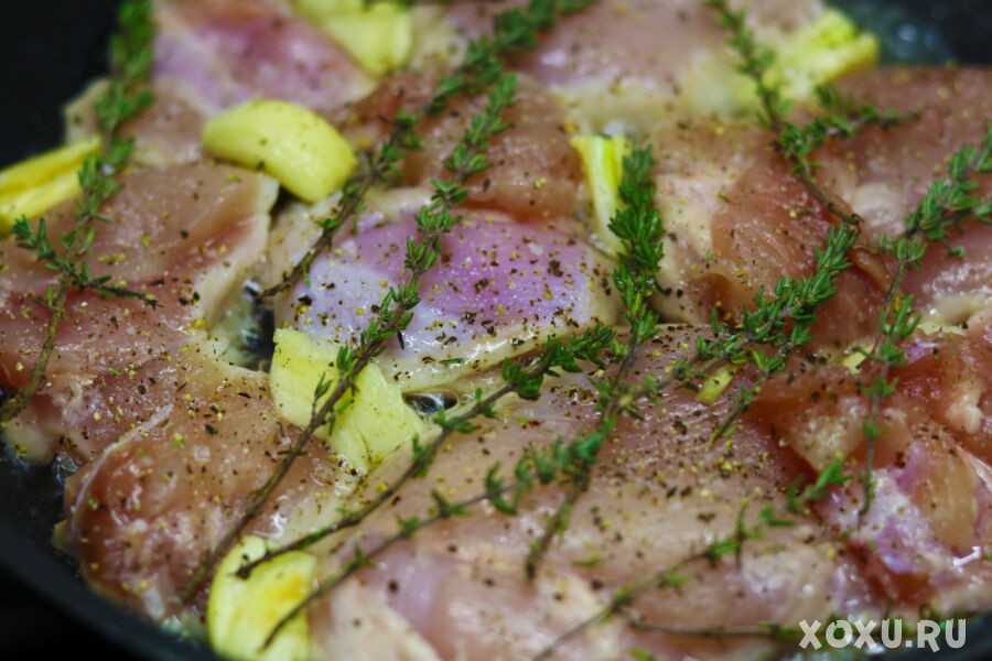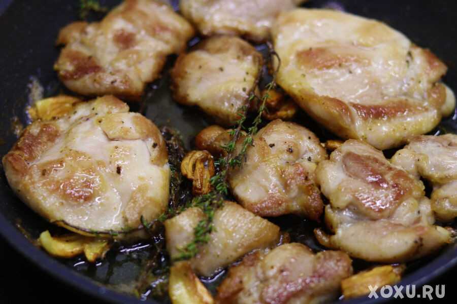 - Курица (обжаривается с Тимьяном и Чесноком на сковороде)
