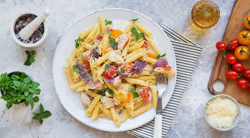 - Прогреть пасту с курицей в сырном соусе на минимальном огне буквально пару минут, после чего ее можно подавать к столу.