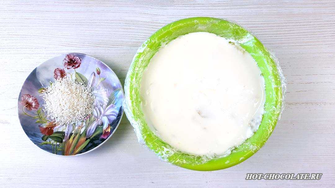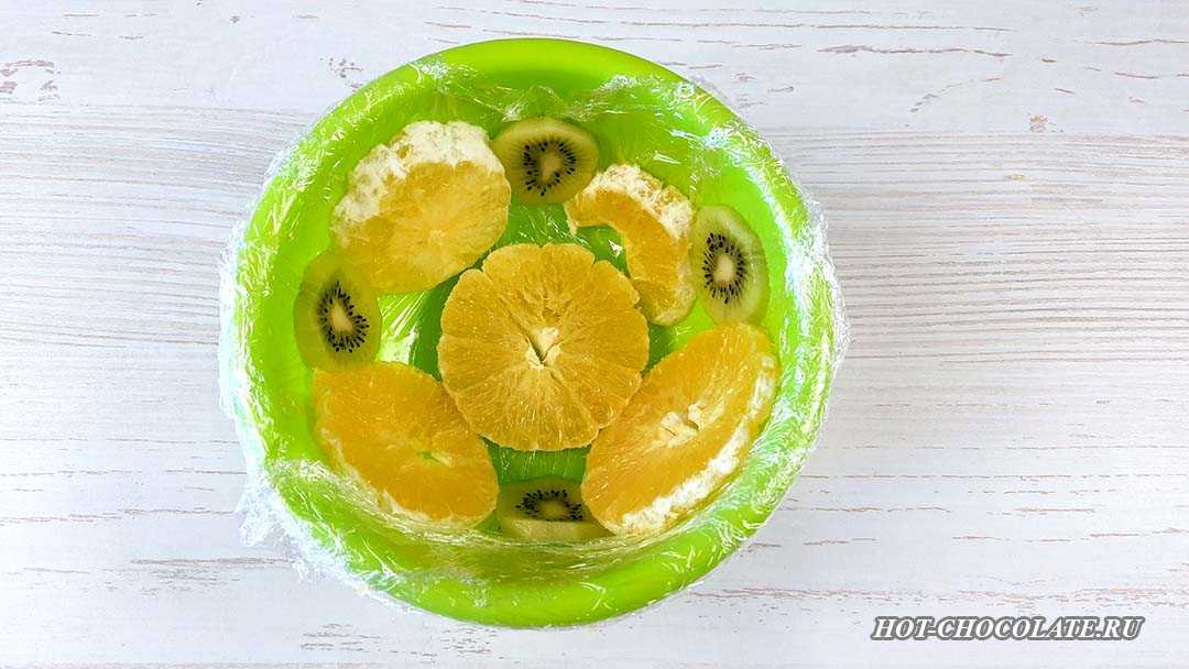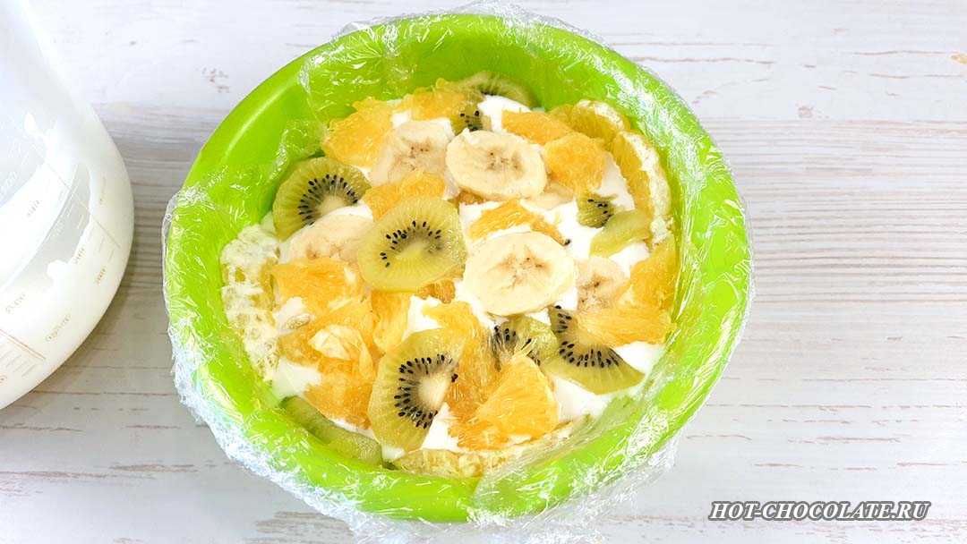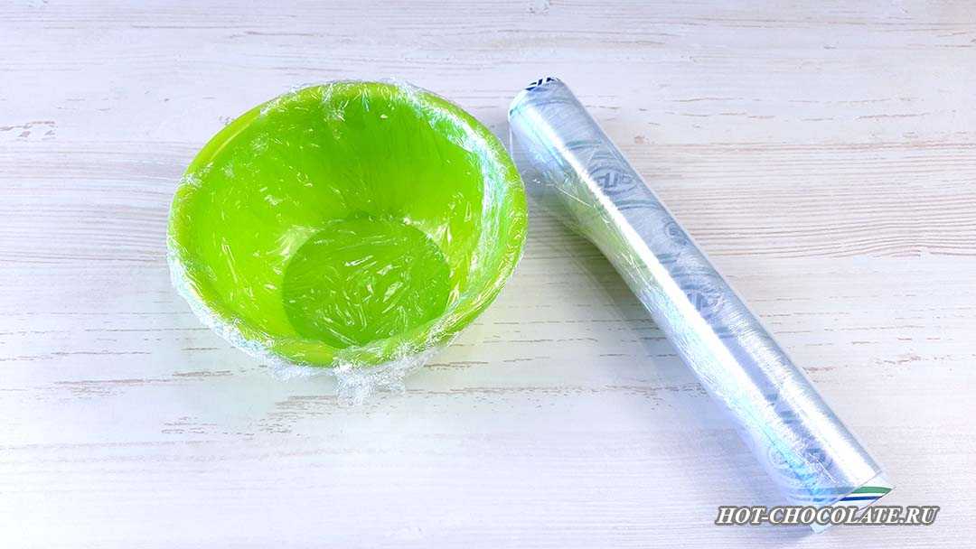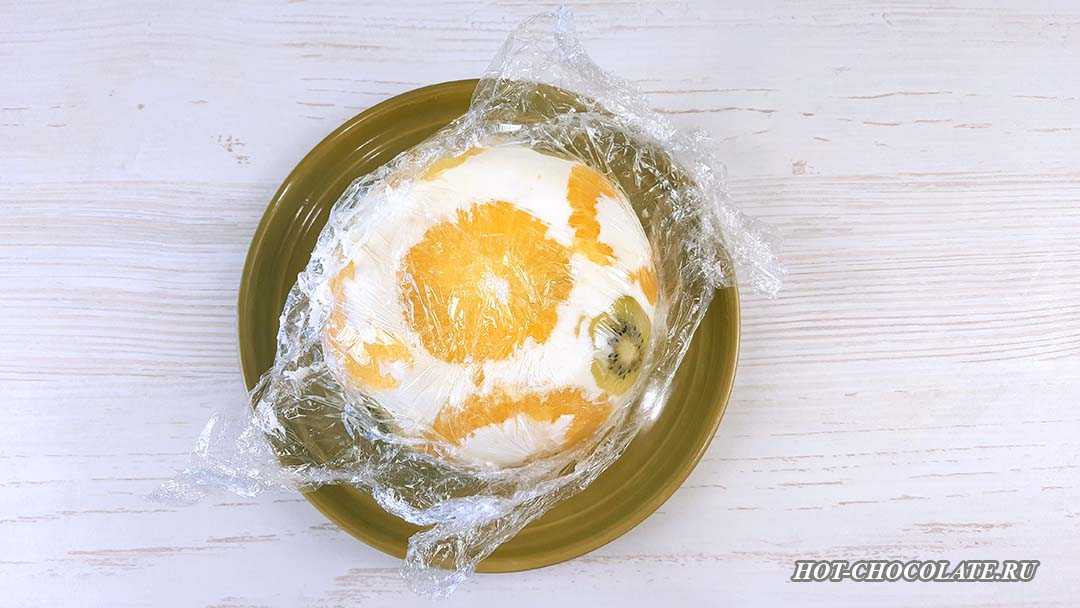 - Заверните десерт в пищевую пленку, отправьте пропитываться и застывать на полку холодильника. Наберитесь терпения на 2-4 часа.