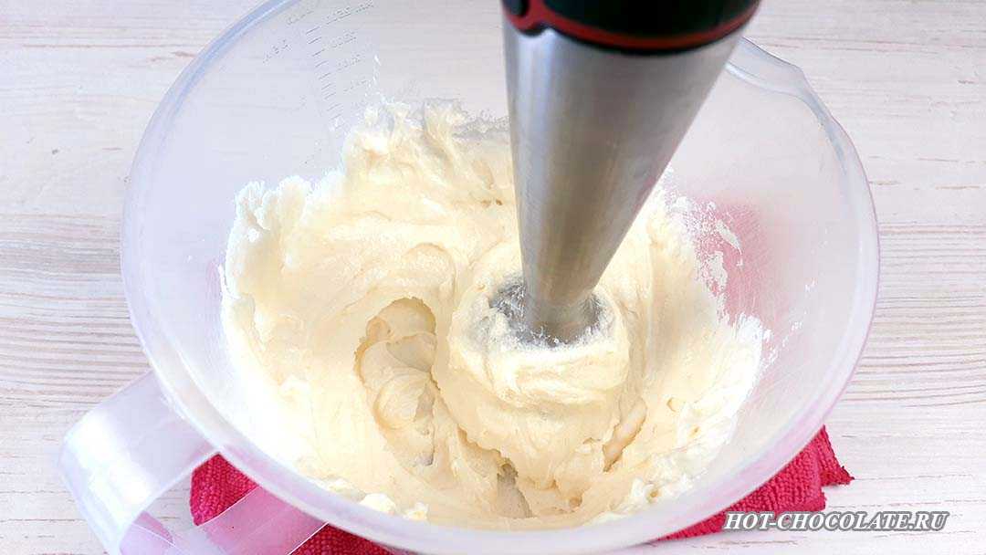 В масляную массу добавить творог и хорошенько растереть блендером.